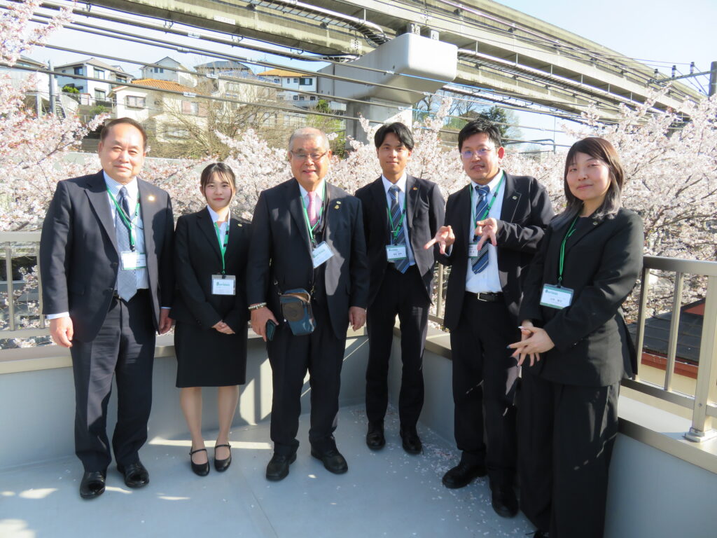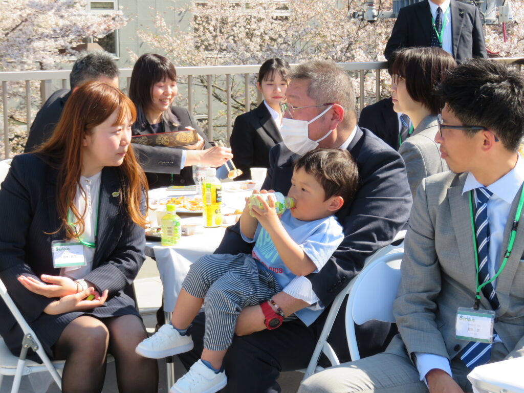 式の終了後は、昨年同様、東日本支社の社屋屋上にて歓迎会を開催しました。 今年は社屋前の桜もちょうど見頃を迎えており、美しい満開の桜を眺めながら、部署の垣根を越えて親睦を深める賑やかなひとときとなりました。
