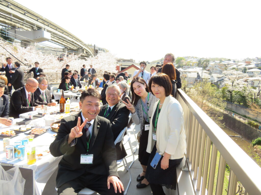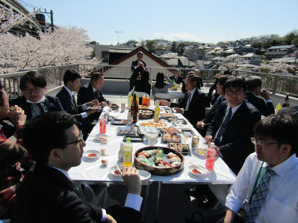 式の終了後は、昨年同様、東日本支社の社屋屋上にて歓迎会を開催しました。 今年は社屋前の桜もちょうど見頃を迎えており、美しい満開の桜を眺めながら、部署の垣根を越えて親睦を深める賑やかなひとときとなりました。